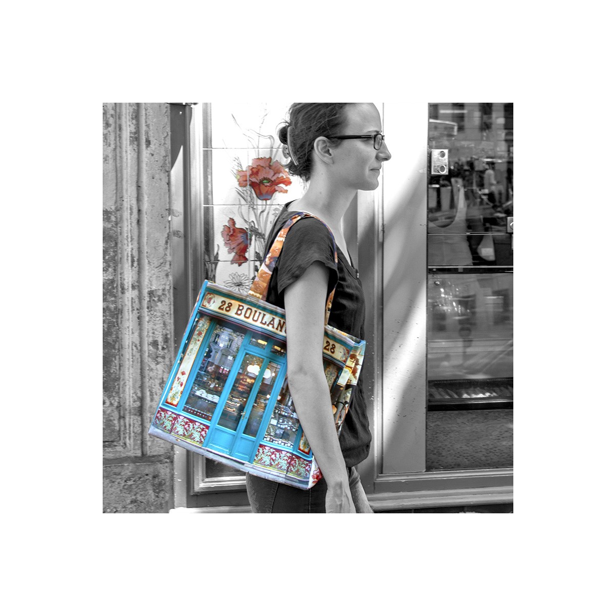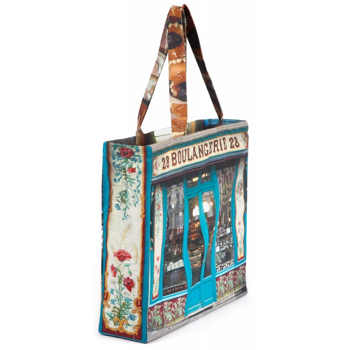 You will not forget to buy the bread with this Bakery storefront printed bag. This Paris retro-style bag by designer Maron Bouillie is full of memories. Street side, it's a photo of the facade of this magnificent Boulangerie 28 with its painted ceramics signed by Benoist & fils in 1900. When you turn this front store bag over you are inside this bread lovers’ dream place.